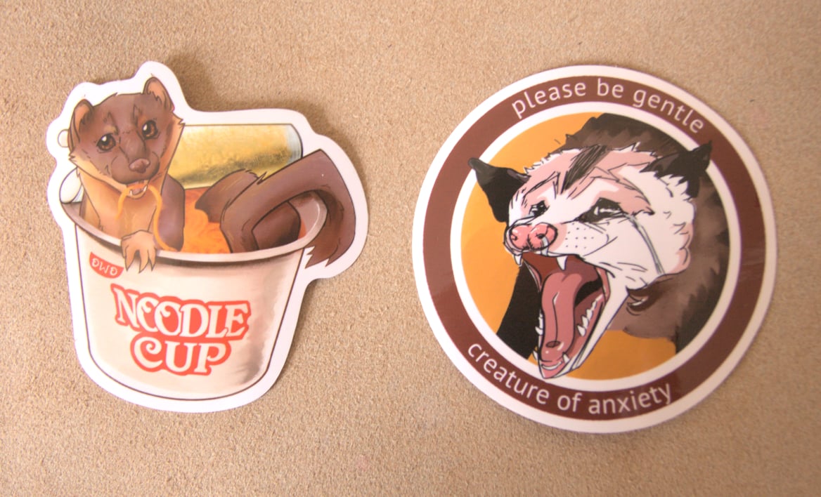 8x8 cm vinyl stickers. Designs by @stormderg on Discord.